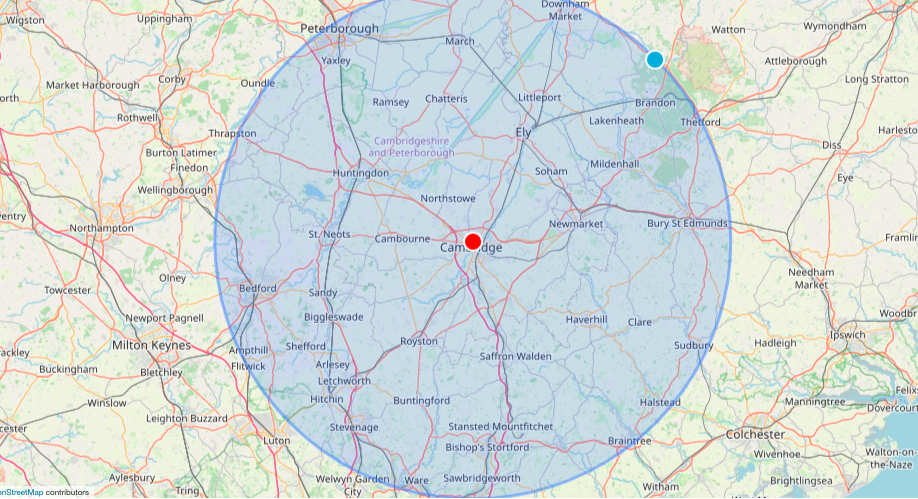 I operate within a 30-mile radius of CB4 3AX, this encompasses the areas outlined on the map.